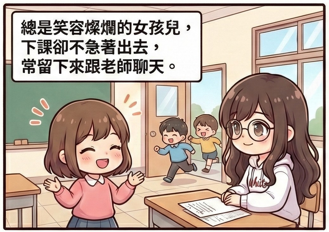 面對即將到來的週末,孩子卻表現出強烈的分離焦慮。這篇四格漫畫記錄了師生間最真摯的情感流動,這份信任與依賴,證明了老師給予的安全感,讓家長看了也心頭一暖。